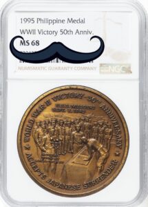 配布対象はメイソン会員や退役軍人で、表面には「WWII Victory – 50th Anniversary」「Accepts Japanese Surrender」と刻まれ、マッカーサー将軍と降伏文書に署名する日本代表が描かれています。