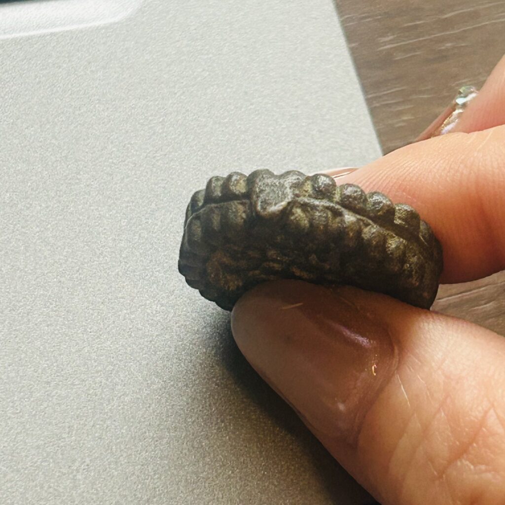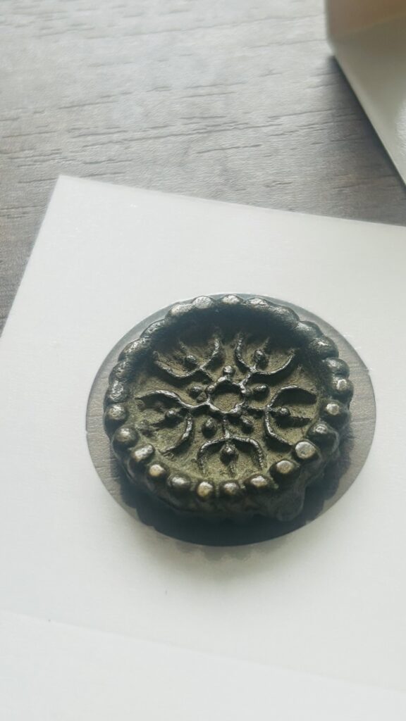 「これ調べてみてよ」と店主から手渡された1枚。文字なし・国名なし。でもずっしり重くて分厚い。両面には三叉矛(トリシューラ)が5方向に放射。…これはただの装飾じゃない。触れていると、千年の祈りの残響が指先に乗る。