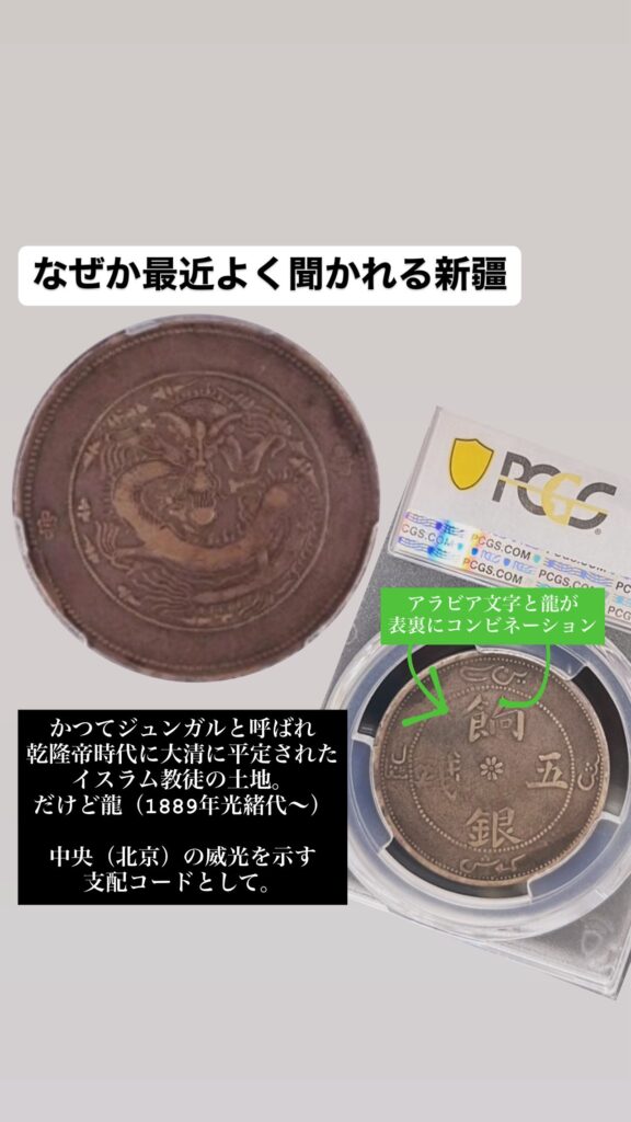 - 新疆:アラビア文字+龍 → イスラム圏へのアピール