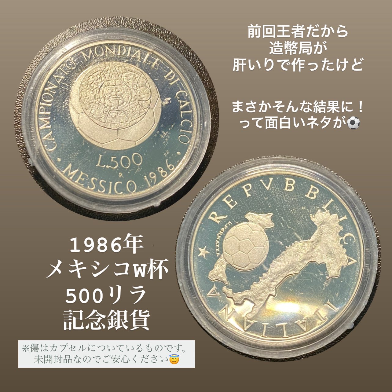 「前回1982年大会の優勝国」という理由で、造幣局が“お祝い&外貨稼ぎ”目的で作った1枚なんです🇮🇹
