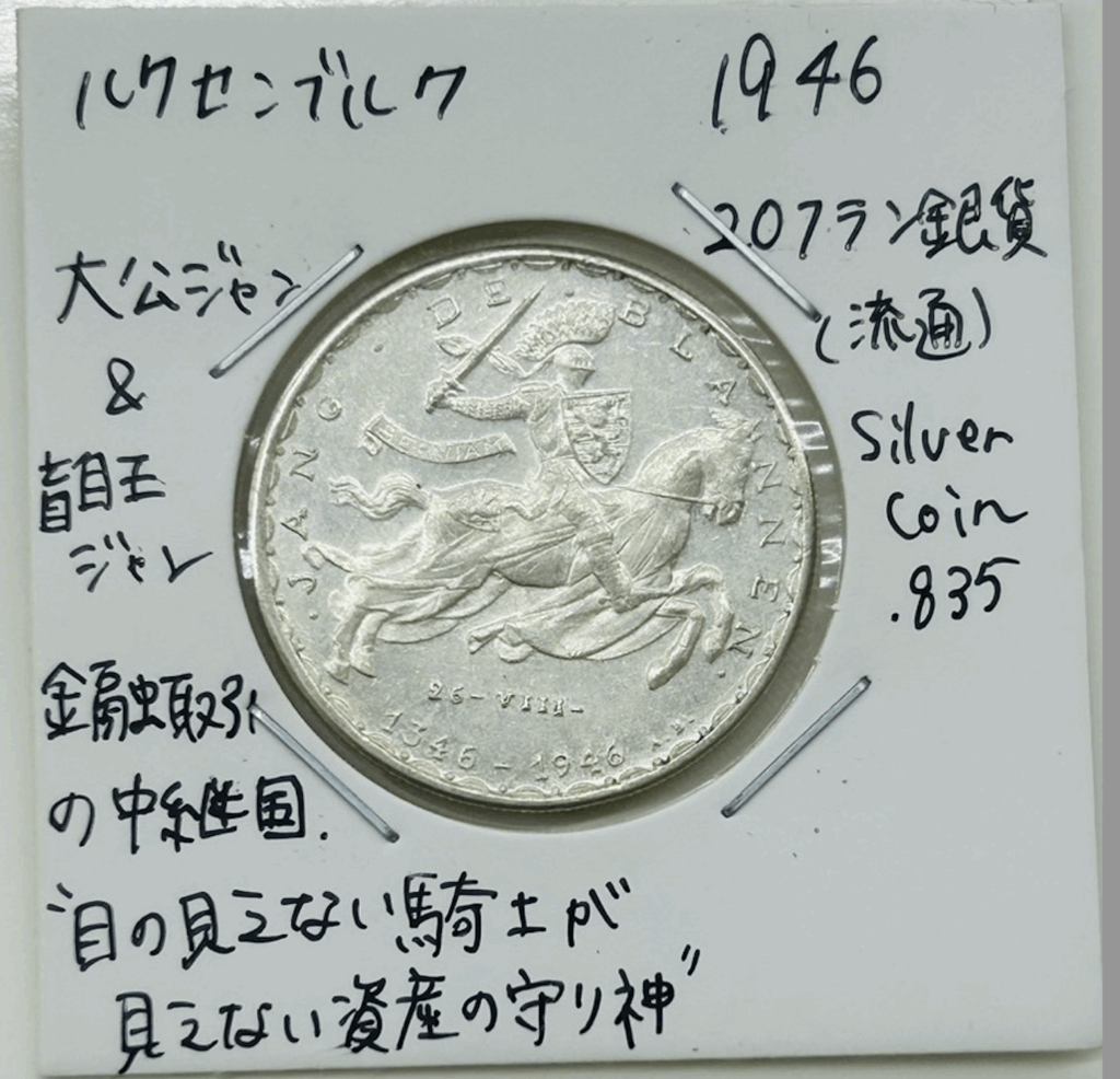 ヨーロッパ金融の“影の中継国”として台頭していくルクセンブルクで発行された、20フラン銀貨(.835)。“ルクセンブルクという国の宿命的役割”が凝縮された一枚です。