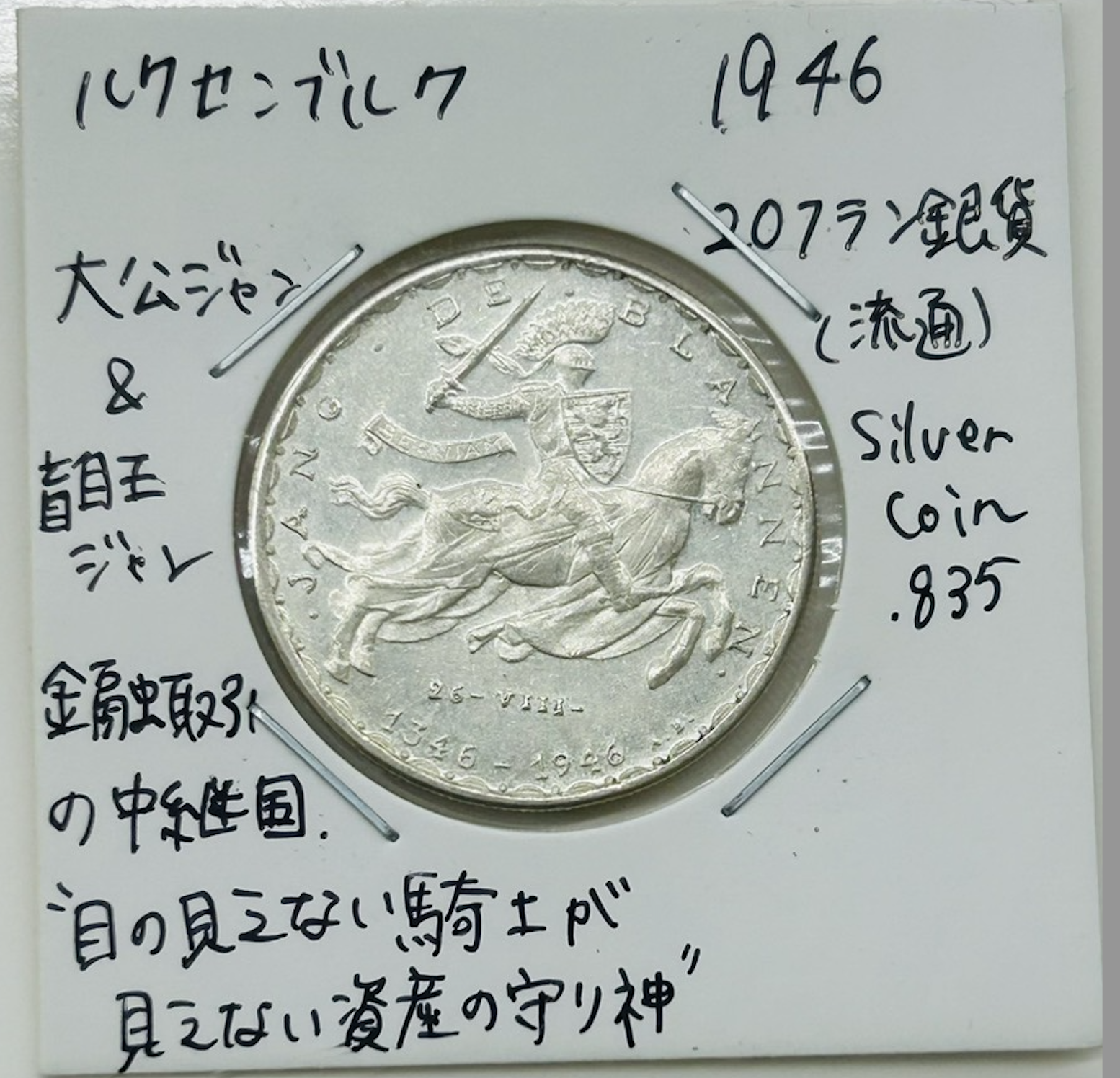 ヨーロッパ金融の“影の中継国”として台頭していくルクセンブルクで発行された、20フラン銀貨(.835)。“ルクセンブルクという国の宿命的役割”が凝縮された一枚です。