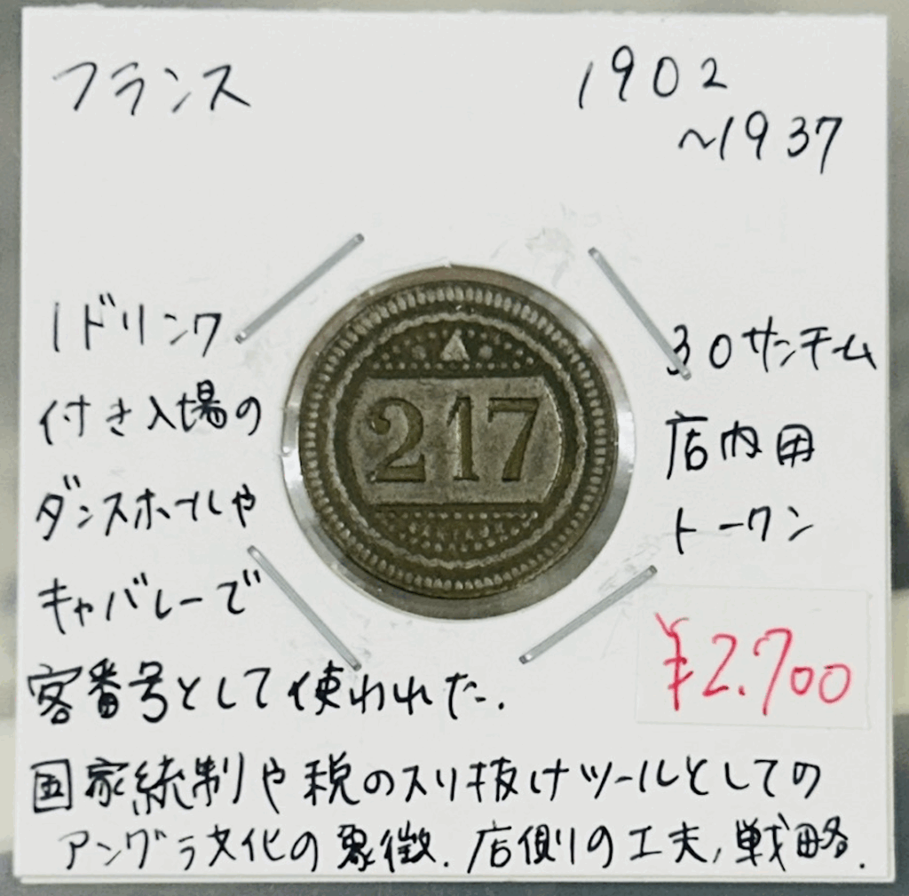 - フランス 30サンチーム《A Consommer》キャバレー・ダンスホール店内トークン(1902–1937)