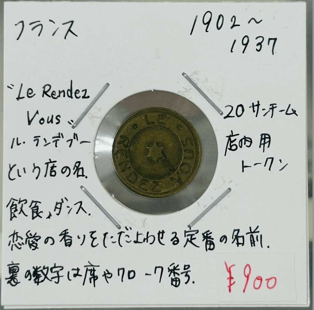 フランス・キャバレー/サロン用20サンチーム店内消費トークン《Le Rendez Vous》刻印タイプ